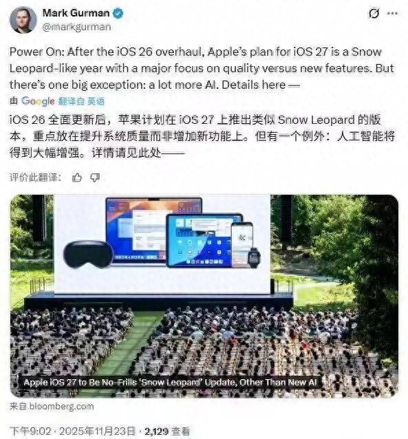 DoNews11月24日讯息,11 月 23 日,马克・古尔曼发布了最新一期 Power On 模式通信。他暗示,苹果来岁将推出以褂讪性为中枢的 iOS 27 系统更新,并在保合手“无新增功能”基调的同期晋升系统质料并强化 AI 身手,苹果但愿借此为后续居品奠定期间基础。