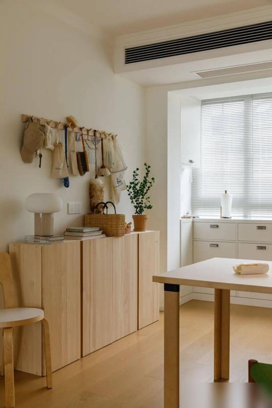 厨房那面墙一敲,立马处罚玄关没地儿放鞋的麻烦,顺带把餐厅光辉也救活了。