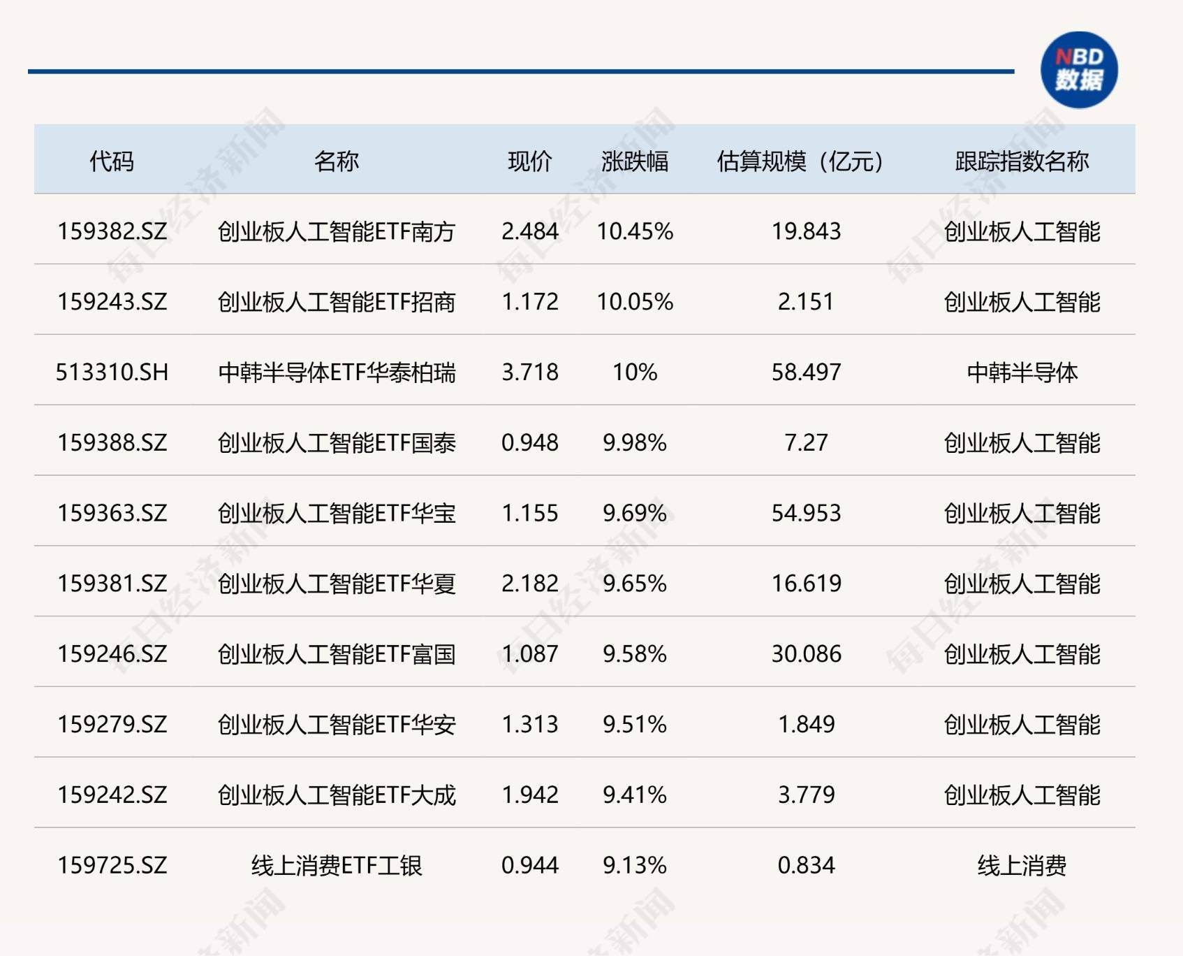 ETF涨跌幅方面,创业板东说念主工智能有关ETF涨约10%。
