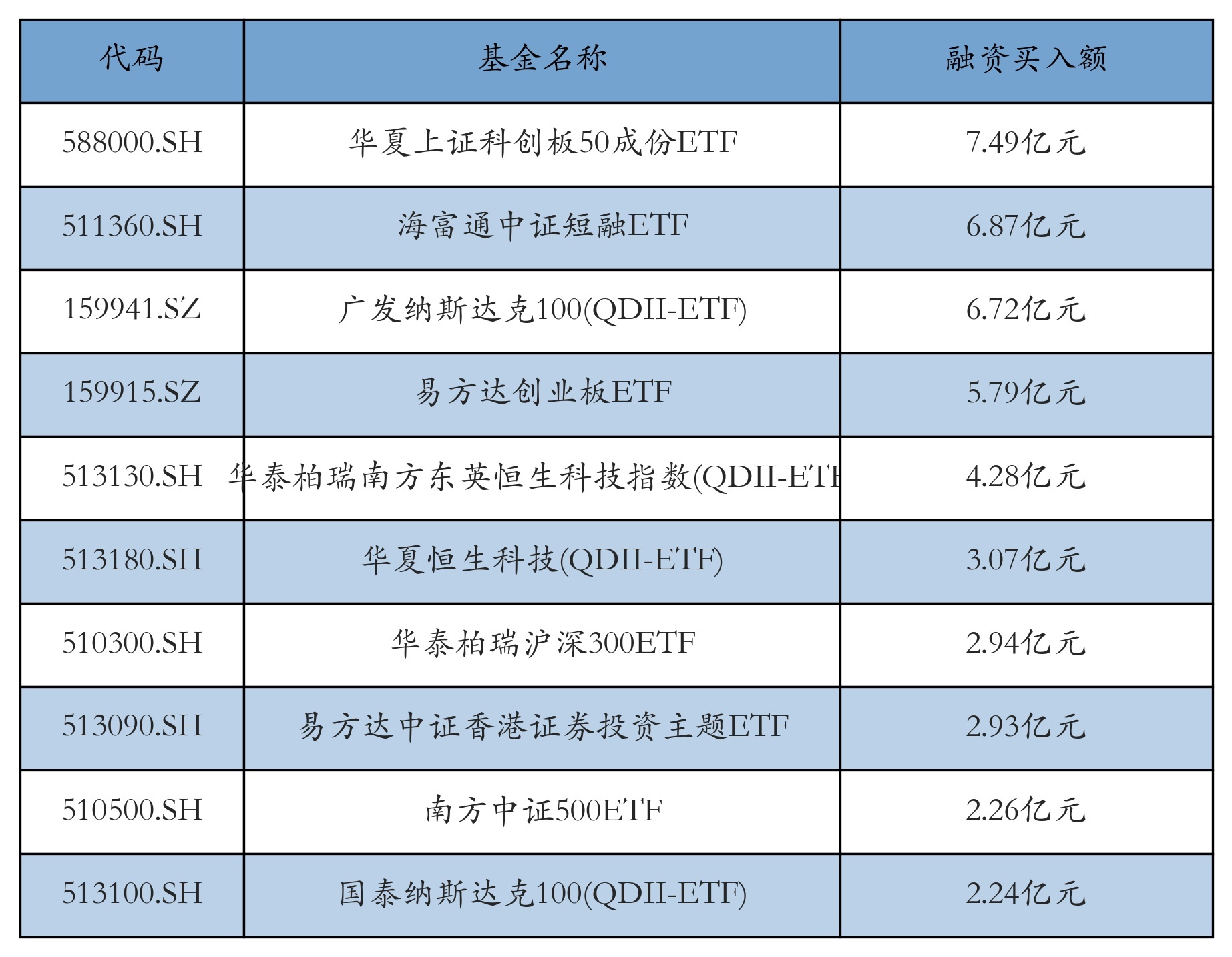 1月13日ETF融资买入额前三位分离为:中原上证科创板50成份ETF(7.49亿元)、海富通中证短融ETF(6.87亿元)和广发纳斯达克100(QDII-ETF)(6.72亿元),前10具体见下表:
