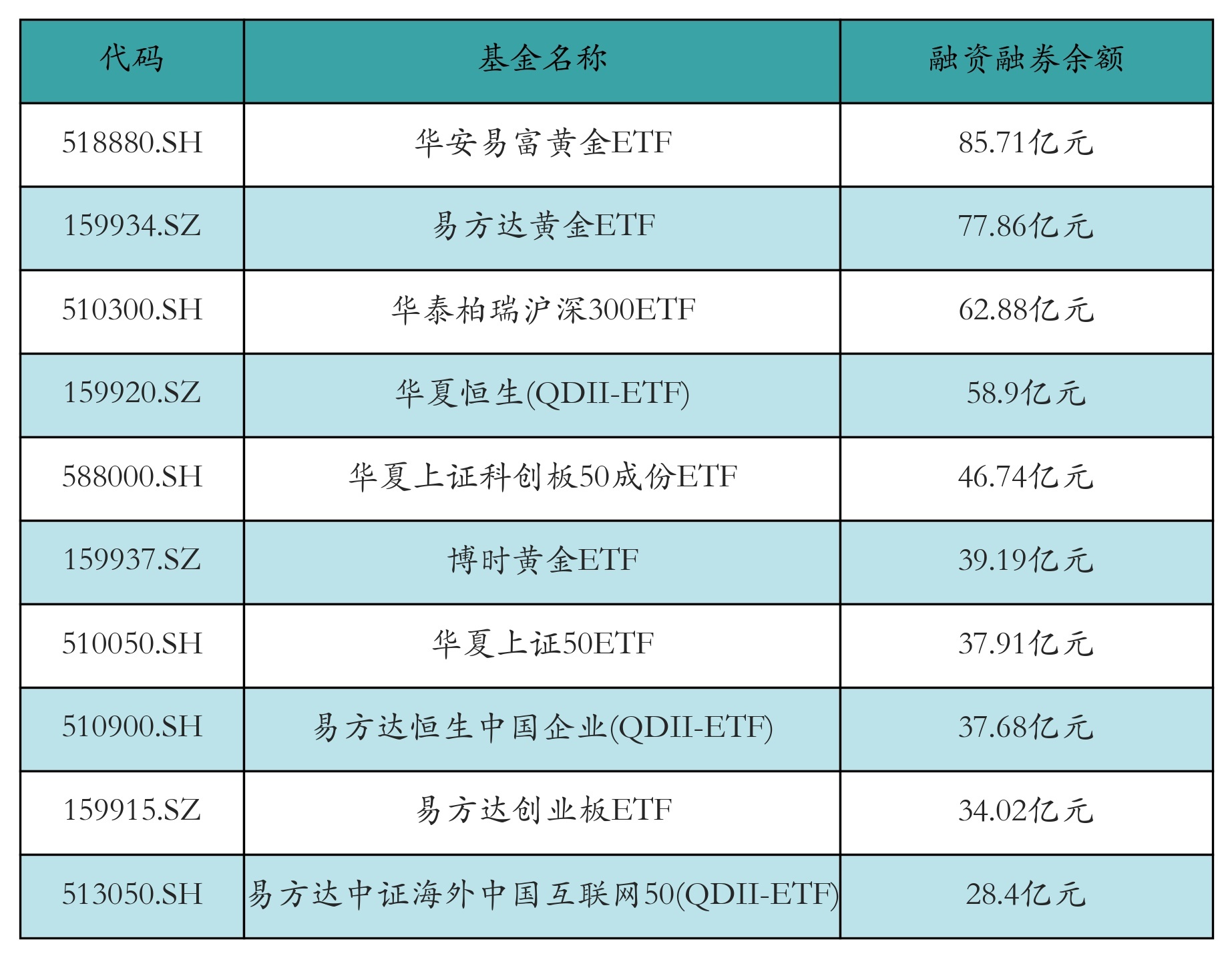 1月13日ETF两融余额前三位分离为:华安易富黄金ETF(85.71亿元)、易方达黄金ETF(77.86亿元)和华泰柏瑞沪深300ETF(62.88亿元),前10具体见下表: