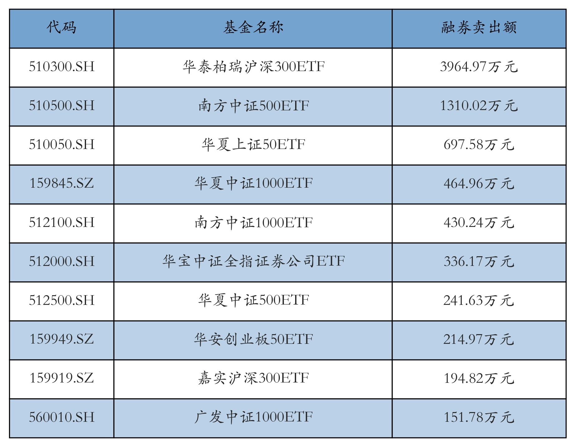 1月13日ETF融券卖出额前三位分离为:华泰柏瑞沪深300ETF(3964.97万元)、南边中证500ETF(1310.02万元)和中原上证50ETF(697.58万元),前10具体见下表: